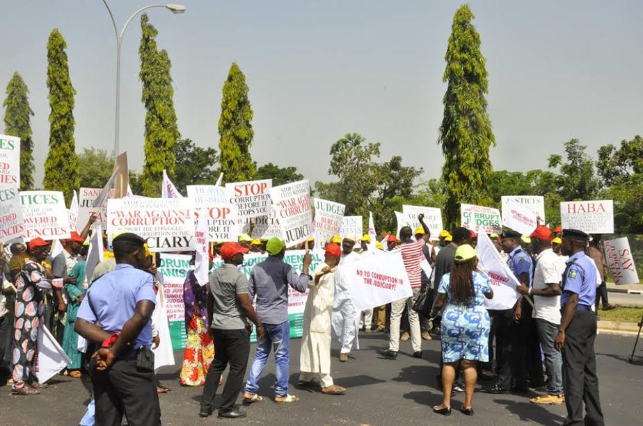 Coalition of 50 NGOs are currently staging a massive protest in Abuja against alleged corrupt practices in the judiciary. The protesters are demanding that the recently arrested serving Judges/Justices should step down until they have cleared their names in court. More photos after the cut.